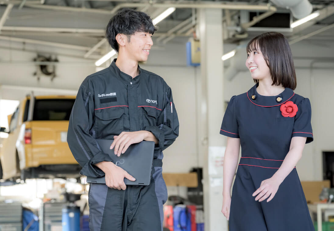 店舗全体の窓口を担っているため、来店していただく全てのお客様が自分の担当だと思って接客しています。お出迎えや点検の受付、引き渡しの際、お客様に名前を覚えていただいたり、「いつも笑顔で素敵だね」などと言っていただくと、お店の一員として認めてもらっているなと嬉しいですね。受付では、点検や整備で訪れたお客様が技術的なことを話されることも多く、不明点は先輩に教えてもらってメモに取るなどして知識を増やし、接客時に答えられるよう努めています。